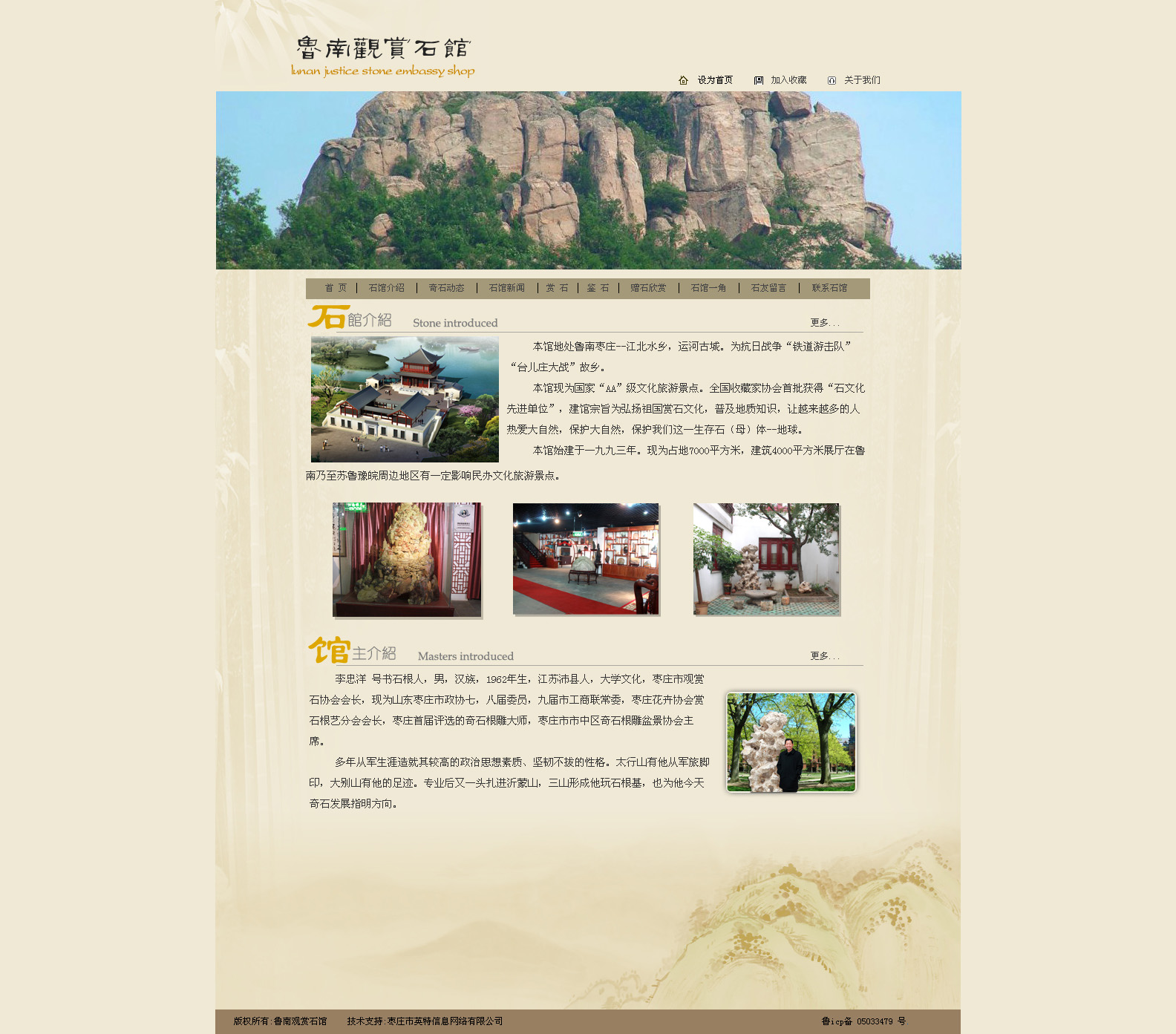 本馆地处鲁南枣庄--江北水乡,运河古城。为抗日战争“铁道游击队”“台儿庄大战”故乡。 本馆现为国家“AA”级文化旅游景点。全国收藏家协会首批获得“石文化先进单位”,建馆宗旨为弘扬祖国赏石文化,普及地质知识,让越来越多的人热爱大自然,保护大自然,保护我们这一生存石(母)体--地球。