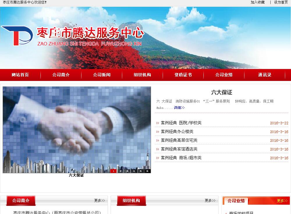 枣庄市腾达服务中心(原枣庄市公安劳服总公司)成立于1979年,属国有企业,1992年被山东消防总队批准具有国家消防设施工程专业的承包二级资质的市级重点单位、山东省消防协会会员单位、枣庄市消防协会、枣庄市建筑业协会理事单位,专业从事自动消防系统工程的设计、施工、安装和维护保养。主要承接各类建筑工程的室内外消防水系统,火灾、报警系统、防烟、排烟系统、消防控制系统、安全疏散指示系统消防系统工程。我公司为了使个用户单位摆脱繁琐的工作程序,为用户单位提供从设计、审批、施工、安装、调试、检测、验收到培训、定期质量检查、年检及维修保养的各种售后服务的一条龙配套服务,尽大能力为个用户单位排忧解难。多年来,多次被枣庄市委市政府评为“重合同,守信用”信得过单位。 |