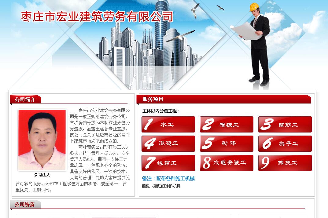 枣庄市宏业建筑劳务有限公司是一家正规的建筑劳务公司,主项资质等级为木制作业分包劳务壹级,涵盖土建各专业壹级。 该公司是为了适应市场经济条件下建筑市场发展而成立的。 宏业劳务公司现有员工300多人,技术管理人员30人,安全管理人员6人,拥有一支施工力量雄厚、工种配套齐全的队伍,具备良好的作风、一流的技术、完善的管理,能够为客户提供优质可靠的服务。公司在工程承包方面的承诺:安全第一、质量优先、工期保时。