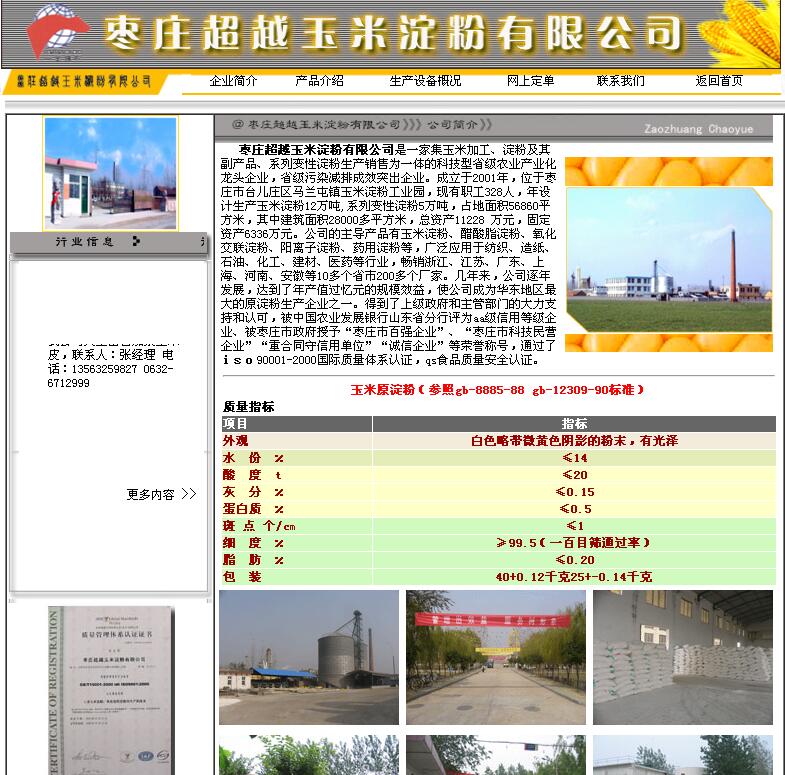 枣庄超越玉米淀粉有限公司是一家集玉米加工、淀粉及其副产品、系列变性淀粉生产销售为一体的科技型省级农业产业化龙头企业,省级污染减排成效突出企业。成立于2001年,位于枣庄市台儿庄区马兰屯镇玉米淀粉工业园,现有职工328人,年设计生产玉米淀粉12万吨,系列变性淀粉5万吨,占地面积56860平方米,其中建筑面积28000多平方米,总资产11228 万元,固定资产6336万元。公司的主导产品有玉米淀粉、醋酸脂淀粉、氧化交联淀粉、阳离子淀粉、药用淀粉等,广泛应用于纺织、造纸、石油、化工、建材、医药等行业,畅销浙江、江苏、广东、上海、河南、安徽等10多个省市200多个厂家。几年来,公司逐年发展,达到了年产值过忆元的规模效益,使公司成为华东地区大的原淀粉生产企业之一。得到了上级政府和主管部门的大力支持和认可,被中国农业发展银行山东省分行评为aa级信用等级企业、被枣庄市政府授予“枣庄市百强企业”、“枣庄市科技民营企业”“重合同守信用单位”“诚信企业”等荣誉称号,通过了iso90001-2000国际质量体系认证,qs食品质量安全认证。 |