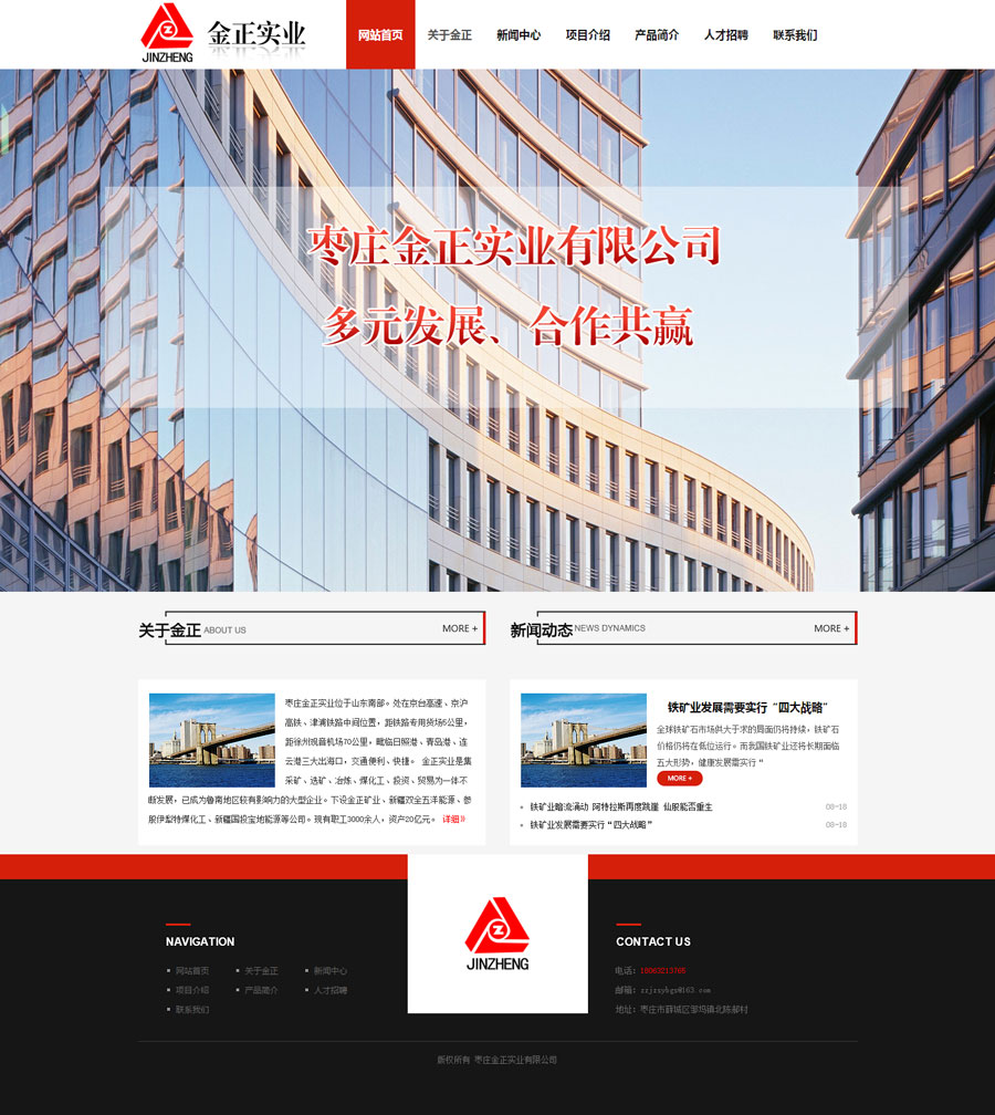 祝贺金正实业有限公司网站上线 公司介绍: 枣庄金正实业位于山东南部。处在京台高速、京沪高铁、津浦铁路中间位置,距铁路专用货场5公里,距徐州观音机场70公里,毗临日照港、青岛港、连云港三大出海口,交通便利、快捷。 金正实业是集采矿、选矿、冶炼、煤化工、投资、贸易为一体不断发展,已成为鲁南地区较有影响力的大型企业。下设金正矿业、新疆双全五洋能源、并参股伊犁特煤化工、新疆国投宝地能源等公司。现有职工3000余人,资产20亿元。先后获得枣庄百强企业、突出贡献企业、诚信经营企业、纳税十强企业、山东省工会工作先进企业等荣誉称号。 金正矿业年产铁精粉60万吨,金正实业年产铸造用生铁26万吨,主要销往江苏、浙江、福建、安徽、河北、山东等地,深受广大客户好评。 公司始终秉承“多元发展、合作共赢”的经营理念,遵循“精诚团结、锐意进取”的企业精神。竭诚为客户提供优质的产品和服务。真诚欢迎各界同仁前来指导、合作,我们愿与您风雨同舟、携手共创美好未来。 枣庄金正实业有限公司
